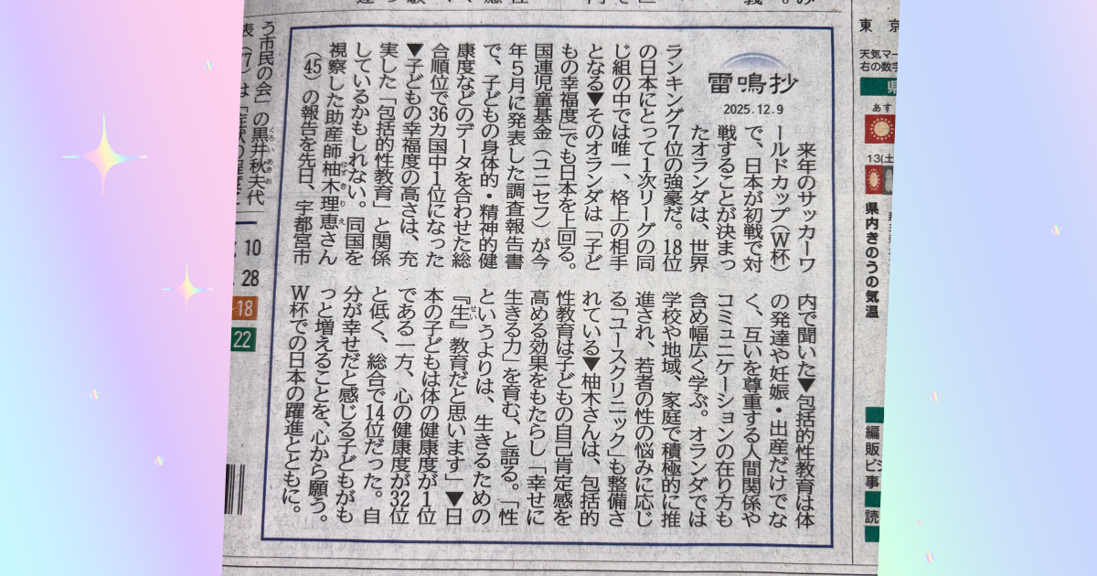 下野新聞 「雷鳴抄」に掲載 2025年12月9日 2025 12/26 イベント 過去のイベント 2025年12月26日 包括的性教育について、熱い思いを語りました。 詳しくは記事をご覧ください。 イベント 過去のイベント よかったらシェアしてね! URLをコピーしました! URLをコピーしました! CAMPFIREで絵本制作に挑戦! 国分寺小学校 職業体験 「あかちゃんのお世話体験」を実施 2025年12月5日 関連記事 国分寺小学校 職業体験 「あかちゃんのお世話体験」を実施 2025年12月5日 2025年12月26日 CAMPFIREで絵本制作に挑戦! 2025年12月26日 ヒューマンフェスタとちぎ2025に登壇! 2025年12月26日 お寺で 茶道×性教育 第二弾開催します! 2025年11月9日 男女共生社会をめざす 第42回うつのみや市民のつどい 2025年11月9日 YouTubeはじめました‼ 2025年11月9日 「女性のエンパワーメント基金 in TOCHIGI」活動成果報告会 2025年11月7日 ヒューマンフェスタとちぎ2025に登壇します‼ 2025年11月7日